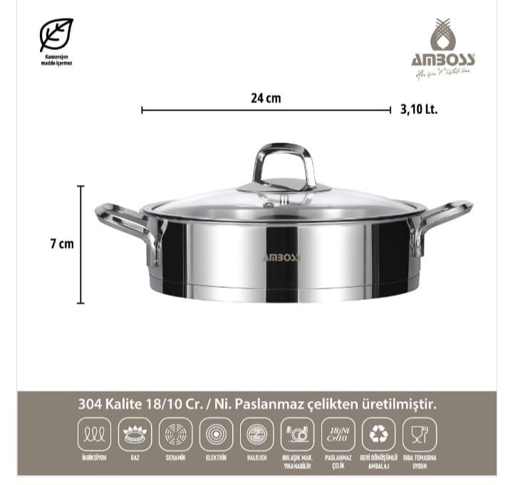 قاعدة فولاذية: مناسبة لجميع أنواع مواقد الطهي (الغاز الطبيعي، والكهرباء، والسيراميك، والحث الحراري). توفر توزيعًا سريعًا ومتساويًا للحرارة.