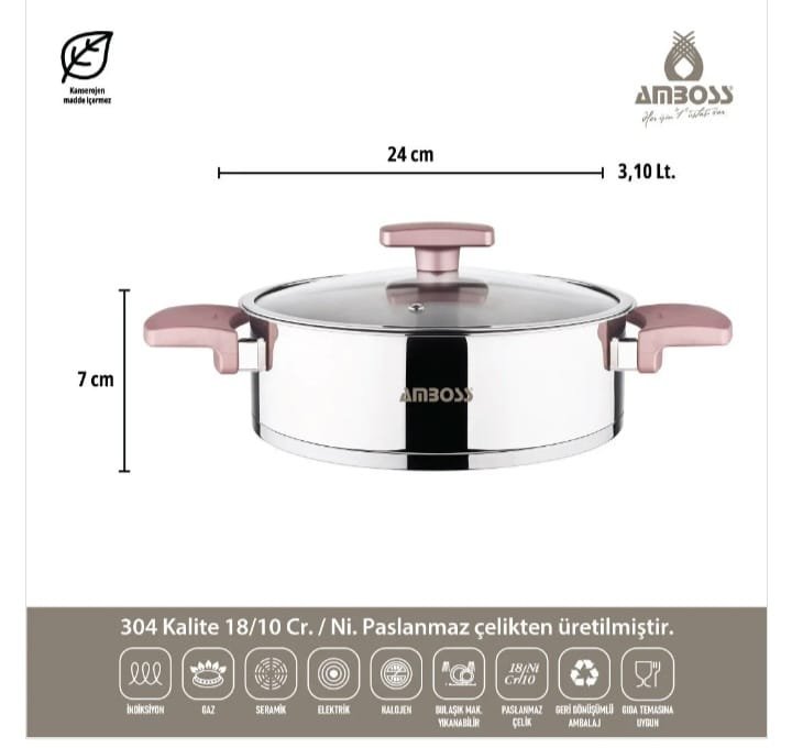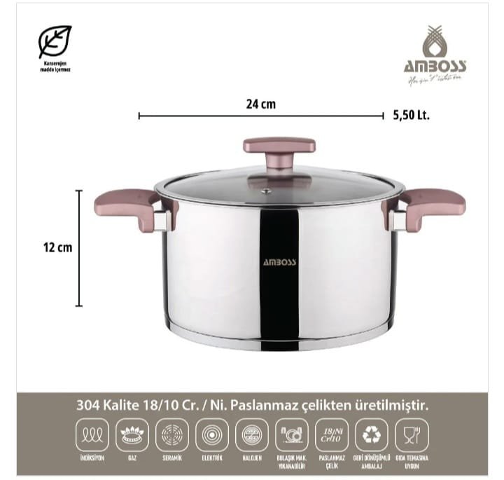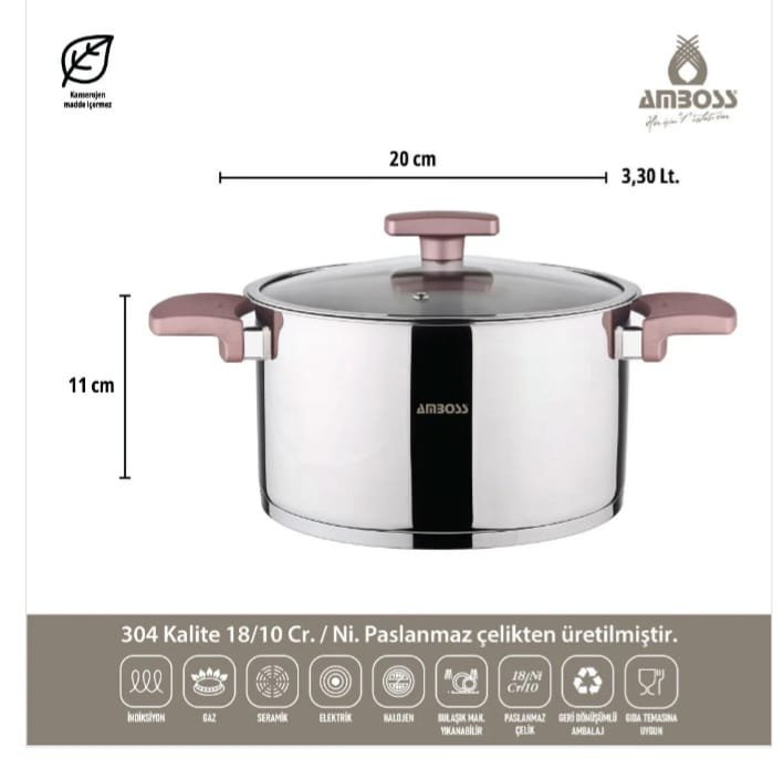 مجموعة أواني طهي AMBOSS DIAMOND من- الاينوكس – الفولاد 18/10 Cr-Ni المقاوم للصدأ، مكونة من 8 قطع، مع غطاء زجاجي
